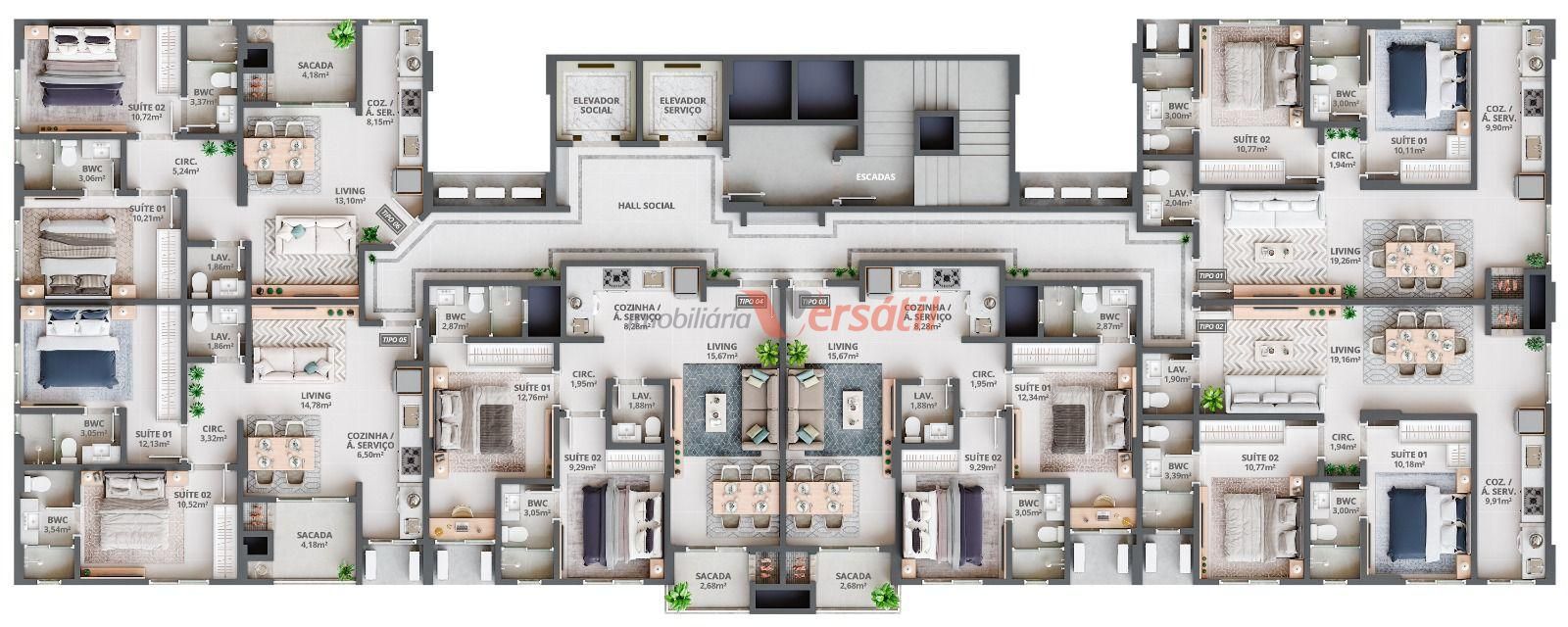- Sacada privativa nos apartamentos tipo 03, 04, 05 e 06.