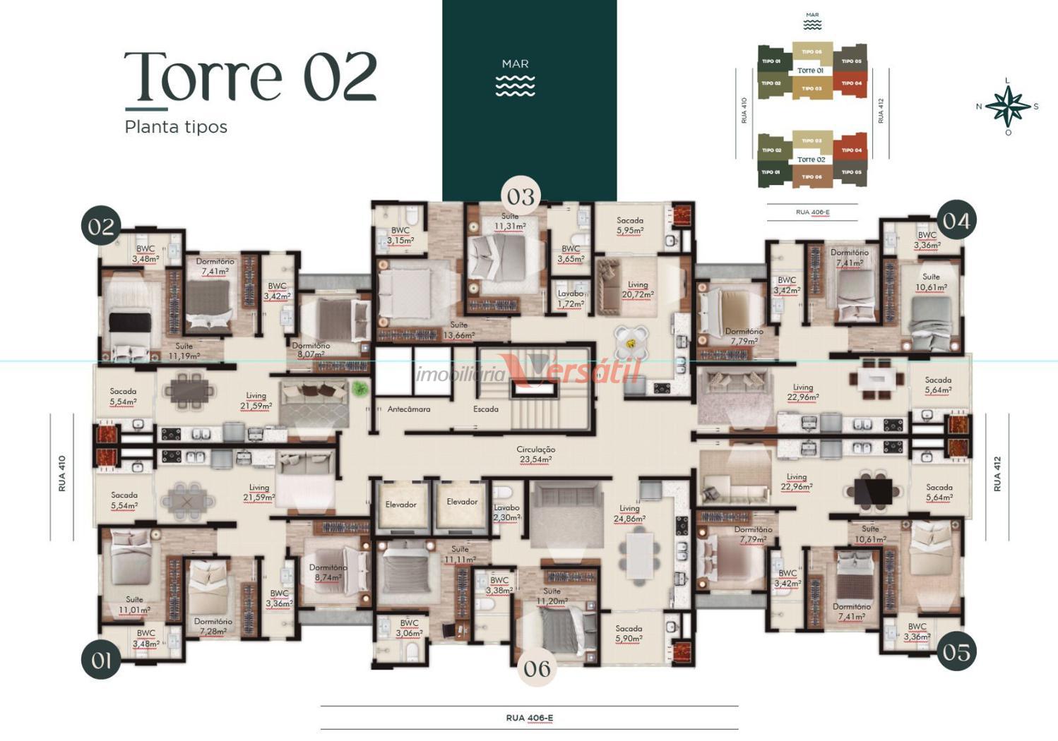 TIPO 01,02,04 e 05 : 03 Dormitórios sendo 01 Suíte