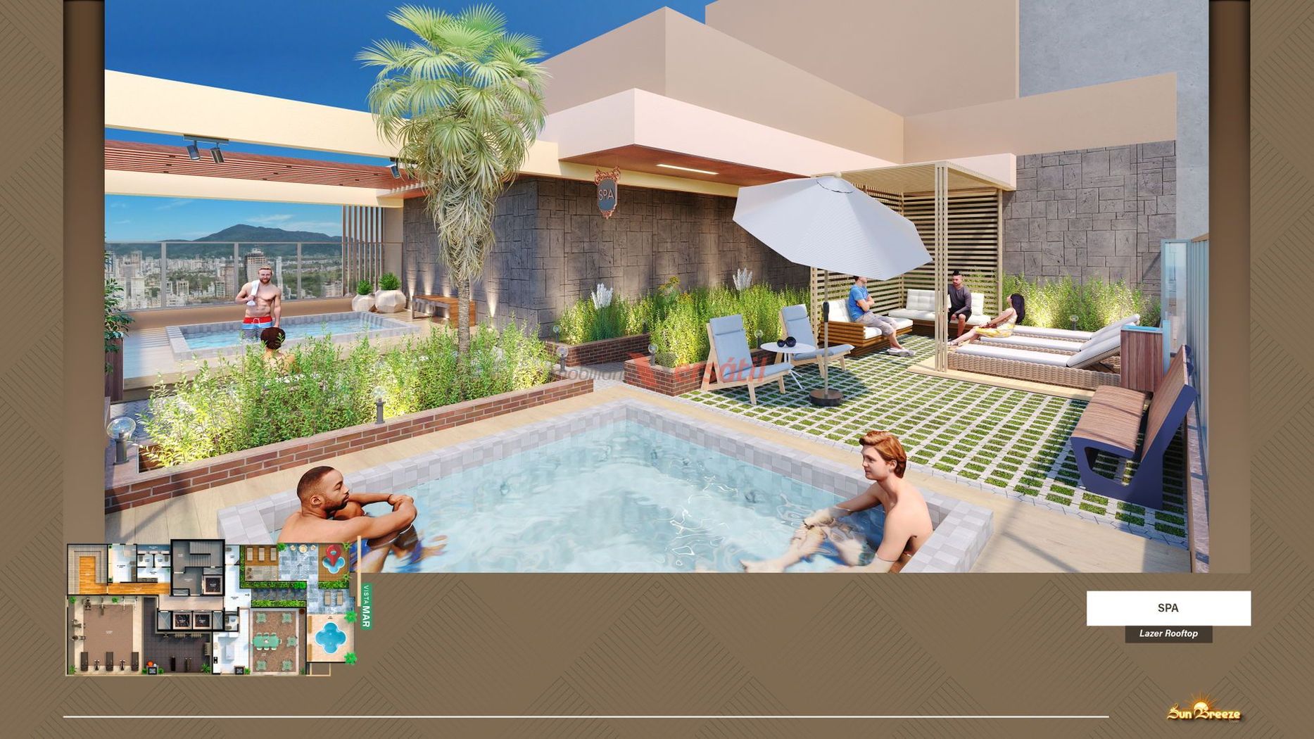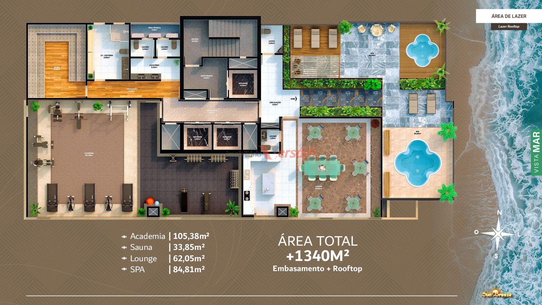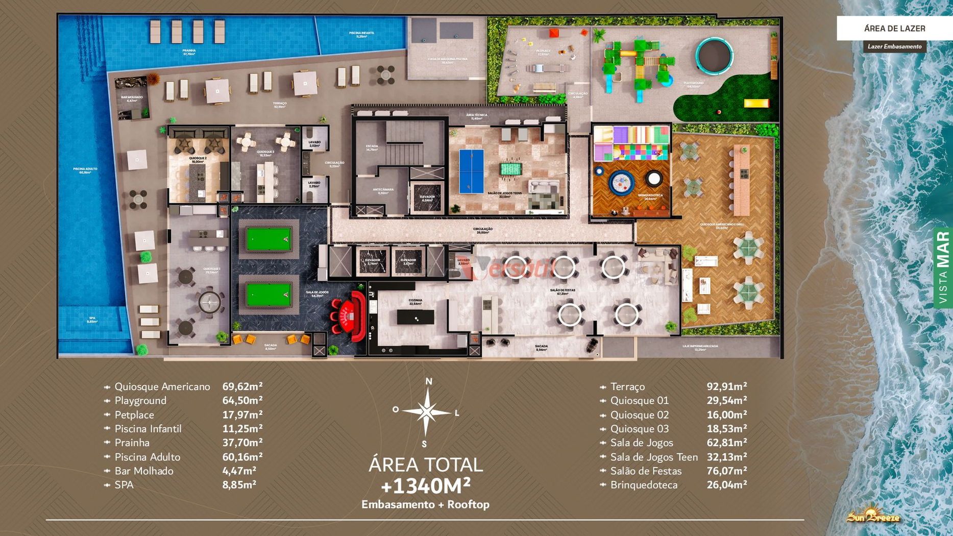O condomínio oferece uma ampla e moderna infraestrutura de lazer e segurança, com piscina adulta e infantil, hidromassagem, sauna, sala de jogos, salão de festas, academia, brinquedoteca, playground, bicicletário e um rooftop com vista privilegiada. Além disso, conta com entrada para banhistas, guarita de segurança, elevador, acesso à internet nas áreas comuns e todos os recursos necessários para garantir uma experiência de moradia completa e confortável.