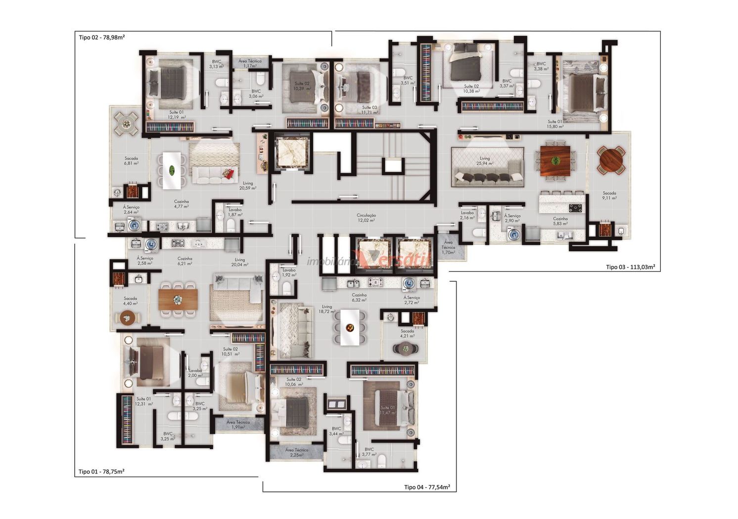 Área privativa de apartamento Tipo 1: 78,55 m²