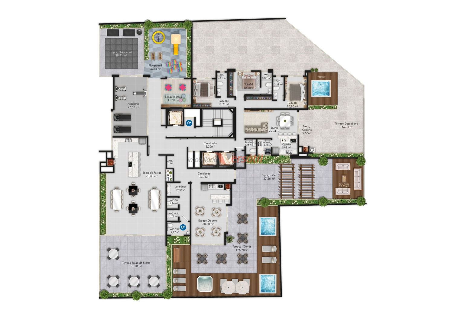 Total área de lazer: 800,18 m²