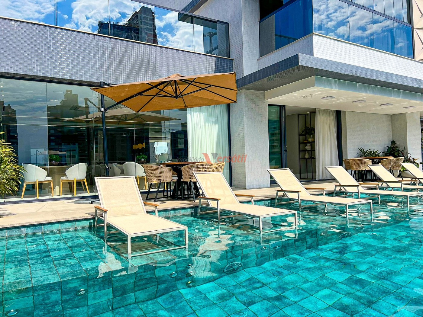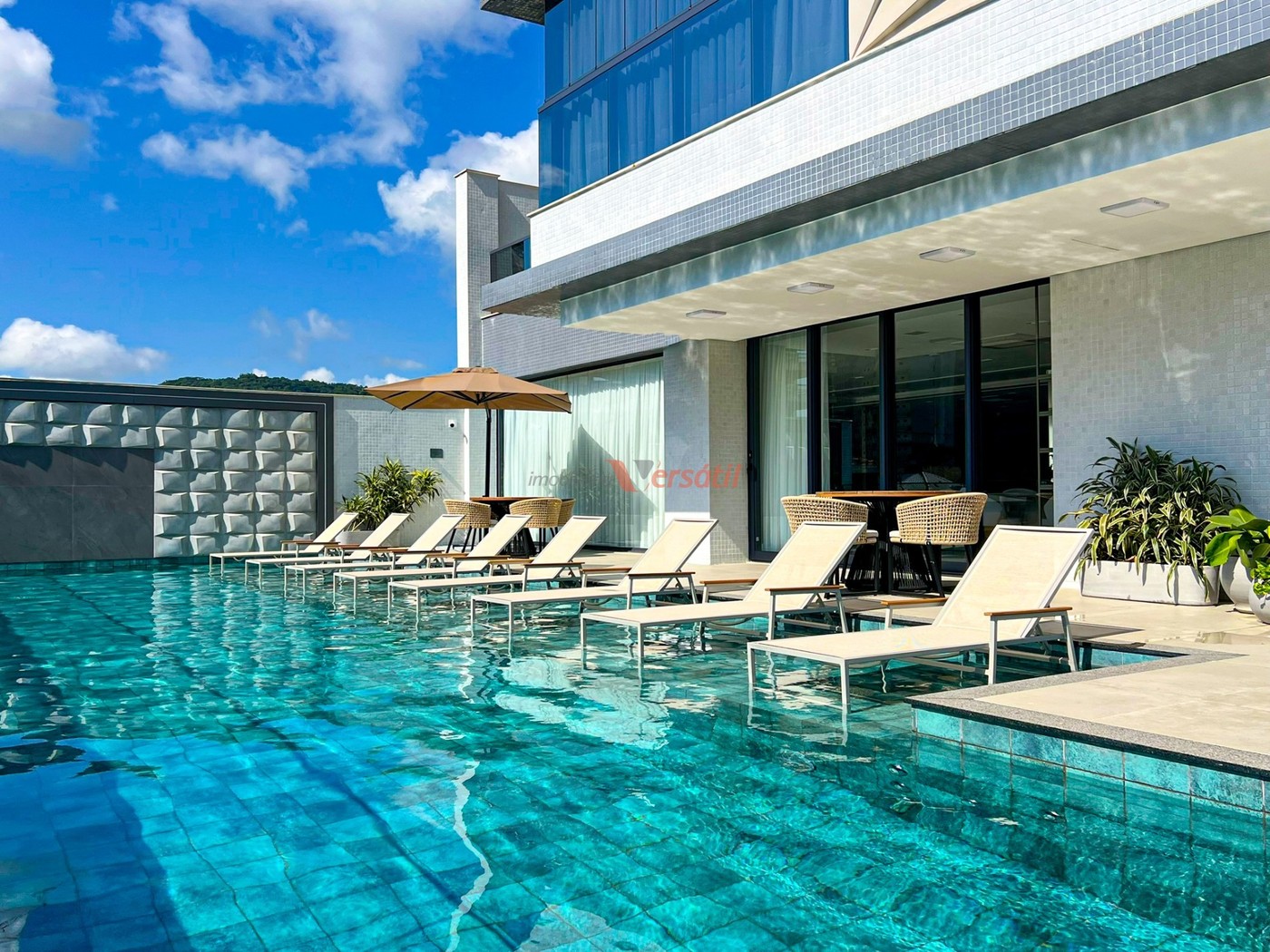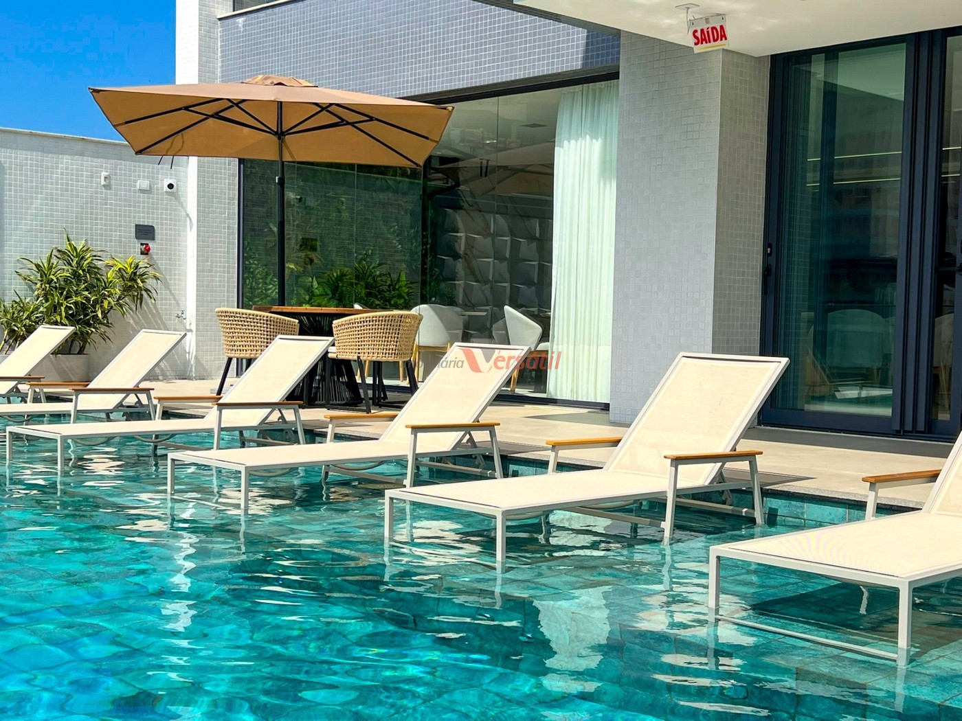 • Espelho d’água com espreguiçadeiras aberto ao sol.