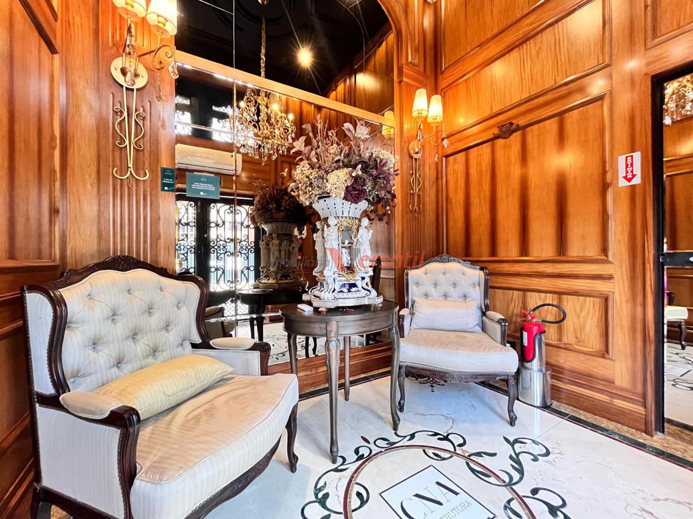 Hall de entrada decorado e mobiliado em estilo neoclássico, sonorizado e climatizado