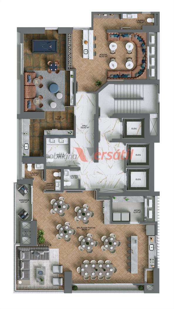 Uma variedade de espaços para relaxar, contemplar, se exercitar e socializar. São 2 pavimentos de lazer, ao todo 919,00m², de ambientes para todos os momentos, gostos e idades.